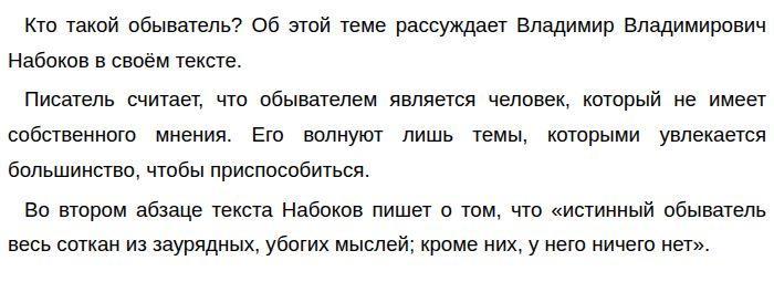 Кто такой обыватель? По В. В. Набокову «Обыватель — явление всемирное…» (ЕГЭ по русскому)![]() То есть эти люди фокусируются только на своих предпочтениях и не считают нужным думать о более глобальных вещах. Человек предпочитает быть как все. Даже книги, которые он читает — это лишь произведения, которыми сейчас интересуется большинство (предложения 9-10). Этот пример показывает, что обыватель — это тот, кто готов пренебрегать своими реальными интересами, чтобы подстроиться под общество. В пятом абзаце текста поэт рассуждает о том, что зачастую именно такие люди больше всего подвержены влиянию рекламы. То есть жертва такого бизнеса, увидев какую-то популярную вещь, обязательно купит её себе, потому что другие это уже приобрели, значит и ей она нужна. Набоков утверждает, что пошлость — тот факт, что реклама считается не распространением полезного продукта, а скорее является предположением, что «человеческое счастье можно купить и что покупка эта в какой-то мере возвеличивает покупателя». Под словом «пошлость» он подразумевает, что популяризация что полезных вещей, что безделушек, даёт людям иллюзию счастья от их покупки, и сами они становятся самодовольными, что очередной раз приобщились, стали «как все». Такой человек как обыватель со своей чертой повторять за большинством будет легко вестись на эту ложную радость (предложения 15-17). Этот пример также доказывает, что обыватель — тот, кто идет на поводу у общественного мнения, концентрируясь на желании принадлежать к определённой группе. Я согласен с автором. Действительно, обыватель — человек, который не стремится к индивидуальности, не желает выделяться, а напротив — он яро хочет приобщиться к остальным. В качестве примера приведу свой опыт. В жизни мне попадался такой человек. Когда мы познакомились, я пыталась выявить у нас общие интересы, чтобы найти темы для разговоров. Однако спустя довольно короткий промежуток времени, я поняла, что он может обсуждать лишь то, что сейчас популярно в обществе. Никаких любимых книг, фильмов, собственных убеждений, глобальных интересов в жизни у него не было. Конечно, такое общение продлилось недолго. Из этой истории я поняла, что очень не хотела бы стать такой же. Мне хочется интересоваться чем-то помимо материальных благ и модных вещей. В заключение хочется отметить, что обыватель — человек, который всецело пытается стать как все, не желающий искать собственные интересы. Обновлено: Опубликовал(а): Jumaisumba Внимание! Спасибо за внимание. Полезный материал по теме