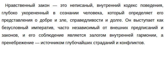 Как вы понимаете, что такое «нравственный закон»? Аргументы Ф. М. Достоевский «Преступление и наказание», М. А. Булгаков «Мастер и Маргарита» (Итоговое сочинение (декабрьское))![]() Это голос совести, который подсказывает человеку, как поступить в той или иной ситуации, и его невозможно заглушить полностью, даже если человек сознательно пытается его игнорировать. Нравственный закон формирует нашу человечность, нашу способность к эмпатии, ответственности и самопожертвованию. Одним из наиболее ярких литературных примеров, иллюстрирующих действие нравственного закона как внутреннего судьи, является главный герой романа Ф. М. Достоевского «Преступление и наказание» Родион Раскольников. Он, руководствуясь своей рациональной «теорией» о «сверхчеловеке», которому дозволено «переступить» через моральные нормы ради великой цели, совершает убийство старухи-процентщицы. Раскольников пытается убедить себя, что его поступок логичен и оправдан, что он избавил мир от «бесполезной воши». Однако сразу после преступления его разумные доводы разбиваются о мощное внутреннее сопротивление. Его мучает не страх перед наказанием со стороны внешнего закона, а невыносимые угрызения совести, лихорадка, отвращение к себе и к миру. Он не может жить нормальной жизнью, его преследуют кошмары, он испытывает отчуждение от всех, кого любит. Это внутреннее страдание, это наказание, исходящее из его собственной души, доказывает силу нравственного закона. Даже когда внешний мир ещё не знает о его преступлении, внутренний голос уже осудил его, и именно этот внутренний конфликт становится главной пыткой Раскольникова, подталкивая его к исповеди и покаянию. Другим убедительным примером, показывающим, что пренебрежение нравственным законом может привести к вечным мукам, является образ Понтия Пилата из романа М. А. Булгакова «Мастер и Маргарита». Прокуратор Иудеи, обладающий огромной властью, сталкивается с дилеммой: он убеждён в невиновности Иешуа Га-Ноцри и даже испытывает к нему симпатию. Его внутренний нравственный закон подсказывает ему, что Иешуа должен быть освобождён. Однако Пилат, боясь гнева кесаря, потери своего положения и возможных политических осложнений, принимает решение, противоречащее его совести. Он «умывает руки» и отдаёт невинного на казнь. Это трусливое пренебрежение внутренним законом приводит его к вечному наказанию: на протяжении двух тысяч лет он вынужден сидеть на каменном кресле, мучимый невыносимой головной болью и сожалением о своём поступке. Его разум помнит каждую деталь того дня, а совесть не даёт покоя. Пилат не осуждён внешним судом, но его собственная душа, его внутренний нравственный закон, не прощает ему предательства истины и справедливости. Его мучения прекращаются лишь тогда, когда Мастер, через Воланда, дарует ему прощение, освобождая от вечной вины. Таким образом, нравственный закон — это не просто набор правил, а неотъемлемая часть человеческой сущности, внутренний компас, который направляет нас к добру и справедливости. Как показывают Достоевский и Булгаков, его нарушение приводит к глубочайшим страданиям и конфликтам, а его голос, даже если его пытаются заглушить, всё равно пробивается сквозь рациональные доводы и внешние обстоятельства. Следование нравственному закону — это залог внутренней целостнос