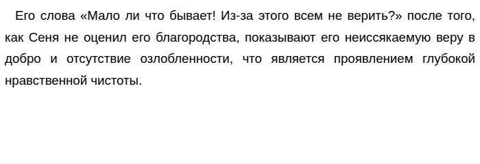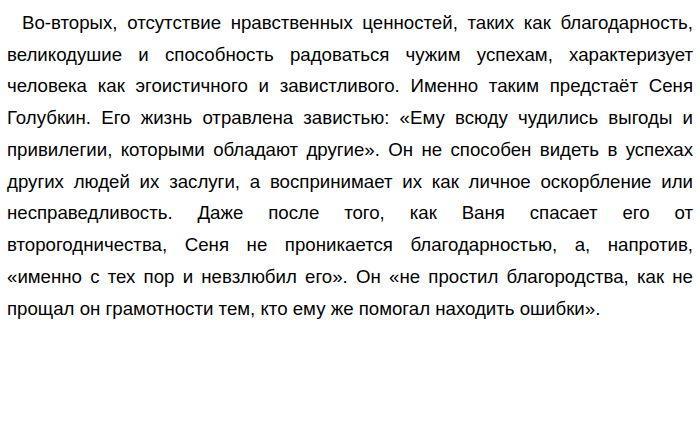 ![]() Это показывает его глубокую нравственную ущербность: Сеня не способен принять помощь, признать чужую доброту, потому что это задевает его эго и заставляет чувствовать себя неполноценным. Его зависть и неблагодарность не позволяют ему развиваться как личности и отталкивают от него людей. Таким образом, нравственные ценности являются основой человеческого характера. Пример Вани Белова демонстрирует, что истинное благородство, сострадание и готовность к самопожертвованию делают человека по-настоящему сильным и достойным уважения. В то же время, Сеня Голубкин показывает, как зависть, неблагодарность и эгоизм разрушают личность, делая её несчастной и неспособной к полноценным отношениям с окружающими. Именно эти внутренние ориентиры определяют, каким человеком мы являемся и какой след оставляем в жизни других людей. Обновлено: Опубликовал(а): GRETA2222 Внимание! Спасибо за внимание. Полезный материал по теме