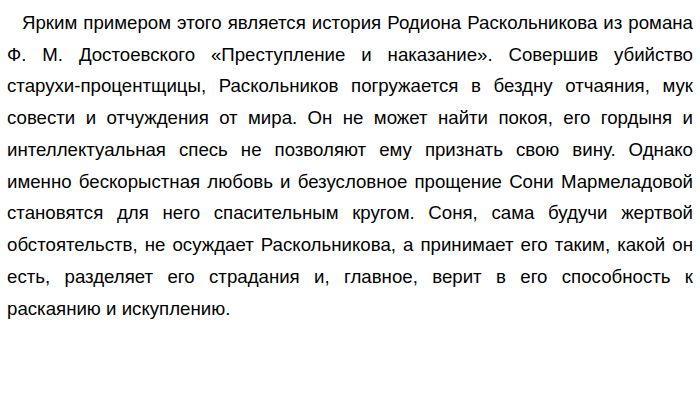 Можно ли простить человека, совершившего зло? Аргументы Ф. М. Достоевский «Преступление и наказание», Л. Н. Толстой «Война и мир» (Итоговое сочинение (декабрьское))Вопрос о прощении человека, совершившего зло, является одним из самых сложных и глубоких в человеческой морали и этике. На первый взгляд, кажется, что простить злодея — значит оправдать его поступок, обесценить страдания жертвы. Однако истинное прощение не равно забвению или попустительству. Это сложный внутренний процесс, который, на мой взгляд, не только возможен, но зачастую необходим для исцеления как того, кто прощает, так и, в некоторых случаях, того, кто совершил зло. Прощение — это не акт слабости, а проявление огромной духовной силы, способной разорвать порочный круг ненависти и возмездия. Во-первых, прощение может стать единственным путём к духовному возрождению для человека, совершившего зло, если оно сопровождается искренним раскаянием. ![]() Её прощение, не означающее забвения преступления, а лишь готовность разделить его бремя и указать путь к Богу, становится тем катализатором, который приводит Раскольникова к исповеди и началу долгого пути к духовному возрождению на каторге. Этот пример показывает, что прощение, исходящее от чистого сердца, способно дать шанс на искупление даже самому заблудшему человеку. Во-вторых, прощение, прежде всего, освобождает самого человека, который прощает, от разрушительной силы обиды, ненависти и жажды мести. В романе Л. Н. Толстого «Война и мир» мы видим, как князь Андрей Болконский, смертельно раненный на Бородинском поле, встречается со своим злейшим врагом — Анатолем Курагиным, который также находится при смерти. Анатоль был причиной его страданий, разрушил его любовь и честь. В обычных обстоятельствах Андрей, возможно, испытывал бы к нему ненависть или желание отомстить. Однако, оказавшись на пороге смерти, в его сердце происходит глубокая трансформация. Вместо ненависти он испытывает к Анатолю сострадание и прощение: «Сострадание, любовь к братьям, к любящим, любовь к ненавидящим нас, любовь к врагам — да, та любовь, которую проповедовал Бог на земле…». Этот акт прощения, это высшее проявление милосердия, освобождает Андрея от бремени обиды и злобы, даруя ему внутренний покой и просветление перед лицом смерти. Его прощение — это не столько для Анатоля, сколько для самого себя, для своей души, которая обретает гармонию, отпустив ненависть. Таким образом, простить человека, совершившего зло, не только возможно, но и глубоко благотворно. Это не означает оправдания зла, но является актом огромной духовной силы. Прощение может стать толчком к раскаянию и искуплению для того, кто совершил зло, и, что не менее важно, оно освобождает прощающего от разрушительной власти обиды и ненависти, даруя ему внутренний мир и возможность двигаться дальше. Способность к прощению — это один из важнейших признаков человечности, позволяющий преодолевать боль и строить будущее, свободное от оков прошлого. Обновлено: Опубликовал(а): GRETA2222 Внимание! Спасибо за внимание. Полезный материал по теме