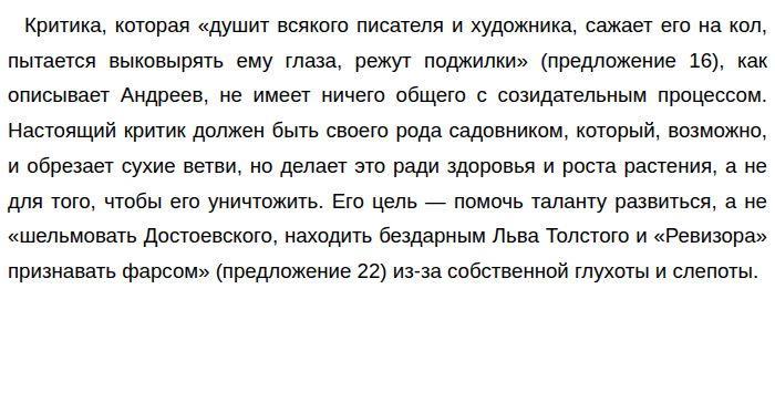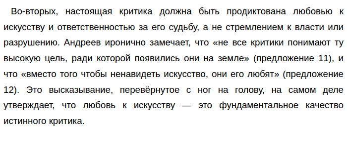 Настоящая критика: какой она должна быть? По тексту Л. Н. Андреева «Как всем известно, жизнеспособность организма познаётся по той степени сопротивления…» (ОГЭ по русскому)Вопрос о сущности и предназначении критики всегда оставался одним из ключевых в мире искусства и литературы. Какова её истинная цель? Должна ли она хвалить или порицать, объяснять или судить? В тексте Л. Н. Андреева мы сталкиваемся с глубоко ироничным взглядом на критику, которая, по мнению автора, зачастую превращается в деструктивную силу. Парадоксально восхваляя невежество и безразличие критиков, Андреев тем самым подчёркивает, какой не должна быть настоящая критика, и позволяет нам вывести её подлинные качества. На мой взгляд, настоящая критика должна быть прежде всего глубоким, чутким и образованным анализом, способным отличить подлинный талант от бездарности и способствовать развитию искусства, а не его подавлению. Во-первых, настоящая критика немыслима без интеллектуальной глубины, чуткости и образованности. В тексте Андреев с горькой иронией утверждает, что «Ум, чуткость, широкий взгляд на мир, талант и образованность вредны критику» (предложение 19), а «наилучшим орудием критика в борьбе является невежество и безразличие к судьбам искусства и людей» (предложение 21). Эта саркастическая похвала невежеству и слепоте указывает на то, что в реальности именно эти качества являются губительными для критики. Истинный критик, напротив, должен обладать острым умом, способностью к глубокому анализу, широким кругозором и знанием контекста, чтобы не «одинаково прихлопывать и горох, и розу, и лопух, и виноград» (предложение 12), а различать их. Только образованный и чуткий человек способен проникнуть в замысел художника, понять его язык и оценить подлинную ценность произведения, а не действовать по принципу «чем критик безразличнее… тем продуктивнее его работа» (предложение 18). ![]()