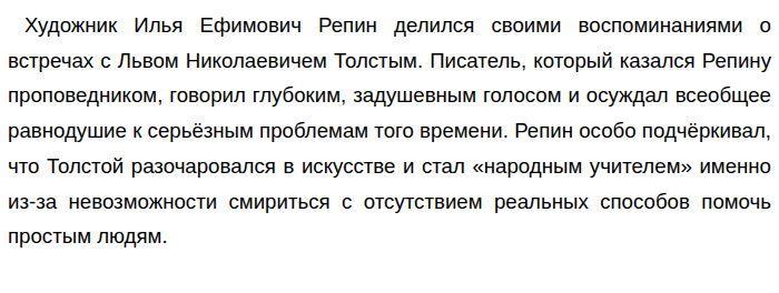 Почему люди начинают отвергать искусство? По И. Е. Репину «В 1880 году в Москве…» Дощинский 1 вариант (ЕГЭ по русскому)Почему люди начинают отвергать искусство? Этот вопрос волнует И. Е. Репина, который с помощью анализа жизни великого современника пытается понять причины столь радикального изменения в системе ценностей. Когда человек понимает, что искусство не соответствует требованиям «серьёзного времени» и не способствует достижению идеалов социальной справедливости, он может начать сомневаться в его ценности. В периоды, когда общество сталкивается с трудностями и проблемами, эстетические удовольствия могут показаться неуместными и даже отвлекающими от более важных задач. В тексте приводятся примеры, которые иллюстрируют эту точку зрения автора. ![]() Он видел в творчестве лишь пустое развлечение и стремился к тому, чтобы его произведения приносили реальную пользу обществу. Писатель говорит И. Е. Репину, что искусство потеряло своё значение. В такое трудное время заниматься творчеством — всё равно что мешать пахарю работать из-за «копошащихся в земле червяков». Эта метафора хорошо передаёт чувство вины и бесполезности, которое люди испытывают, видя пропасть между искусством и реальностью. И. Е. Репин замечает, что люди перестают ценить искусство, потому что оно создаёт ложные идеалы красоты, отдаляя от правды жизни. Второй пример раскрывает и дополняет первый. Сначала автор размышляет о значении искусства, а затем переходит к его сути и задачам. В итоге он приходит к мысли, что искусство отвергается, когда человек переоценивает свои ценности и глубоко осознает острые социальные проблемы. Когда совесть обостряется, люди ищут не красоту, а справедливость. Если искусство не отвечает на этот внутренний запрос, оно воспринимается как пустое и даже безнравственное. Нельзя не согласиться с И. Е. Репиным. Действительно, длительные размышления заставляют сомневаться в том, что раньше казалось важным. Человек, стремящийся принести пользу обществу, старается не тратить время и силы на бесполезные занятия. Например, Рябинин из рассказа В. М. Гаршина «Художники» не понимает, зачем нужно «чистое искусство», как у Дедова. По мнению Рябинина, художник должен изображать страдания людей, иначе искусство теряет смысл. Эта литературная история показывает, что конфликт между эстетикой и этикой — это вполне закономерное явление. Чтобы не отвергать произведения искусства, нужно видеть их ценность для других и понимать, что искусство многогранно. Оно помогает бороться с социальным злом и дарит утешение. Искусство сохраняет красоту и пробуждает в людях светлые чувства, что важно для духовного здоровья общества. Обновлено: Опубликовал(а): Ilya Garmah Внимание! Спасибо за внимание. Полезный материал по теме