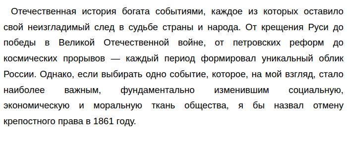 Какое событие в отечественной истории Вы считаете особенно важным? Аргументы И. С. Тургенев «Бирюк», Н. А. Некрасов «Кому на Руси жить хорошо?» (Итоговое сочинение (декабрьское))![]() Это событие не просто освободило миллионы людей от рабства, оно запустило цепную реакцию преобразований, определивших дальнейшее развитие страны на десятилетия вперед, и стало отправной точкой для осмысления человеческого достоинства и свободы в русском обществе. Важность отмены крепостного права заключается, прежде всего, в моральном освобождении и признании человеческого достоинства миллионов людей. Крепостное право было позорным пятном на теле России, формой рабства, которая противоречила всем принципам гуманности и прогресса. Его отмена стала актом высшей справедливости, пусть и половинчатой, но необходимой. Литература XIX века ярко отразила всю глубину трагедии крепостничества и предвкушение его конца. Так, в «Записках охотника» И. С. Тургенева мы видим галерею образов крепостных крестьян — талантливых, умных, глубоко чувствующих людей, чьи судьбы были искалечены произволом помещиков. Истории Акулины, Касьяна с Красивой Мечи, Бирюка — это не просто зарисовки деревенского быта, а пронзительные свидетельства о человеческой душе, запертой в оковах несвободы. Тургенев, гуманизируя крестьян, показывая их внутренний мир, их страдания и мечты, подрывал моральные основы крепостничества. Его произведения стали мощным аргументом в пользу необходимости освобождения, доказывая, что крепостные — это не имущество, а полноценные люди, достойные свободы и уважения. Отмена крепостного права, таким образом, была не просто экономическим или политическим решением, а актом морального очищения нации. Второй аспект, подчеркивающий исключительную важность этого события, — это запуск глубоких социальных и экономических преобразований, которые сформировали новую Россию, пусть и с множеством противоречий. Отмена крепостного права разрушила веками сложившуюся аграрную систему и феодальные отношения, открыв путь к капиталистическому развитию. Однако этот процесс был крайне болезненным и породил множество новых проблем. Н. А. Некрасов в поэме «Кому на Руси жить хорошо» ярко изображает жизнь крестьян уже после реформы 1861 года. Он показывает, что юридическая свобода не всегда означала реальное благополучие. Крестьяне сталкивались с выкупными платежами, малоземельем, сохранением помещичьего произвола и новыми формами эксплуатации. Поэма Некрасова — это исследование того, как «свобода» обернулась для многих новыми страданиями, но при этом она же дала толчок к осознанию своих прав, к поиску справедливости, к формированию нового крестьянского самосознания. Отмена крепостного права, несмотря на все свои недостатки и последствия, стала тем переломным моментом, который необратимо изменил структуру общества, запустил процессы урбанизации, развития промышленности, формирования новых социальных слоев и, в конечном итоге, подготовил почву для дальнейших революционных потрясений. Таким образом, отмена крепостного права в 1861 году является, на мой взгляд, важнейшим событием отечественной истории. Оно не только освободило миллионы людей, но и стало катализатором глубочайших моральных, социальных и экономических изменений. Это был акт признания человеческого