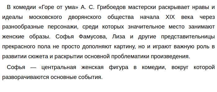 Значение женских образов в комедии «Горе от ума» (Грибоедов А. С.)![]() Её образ многогранен и противоречив: с одной стороны, она стремится к независимости и искренним чувствам, с другой — остаётся заложницей общественных предрассудков и традиций. Софья выбирает Молчалина, видя в нём надёжность и стабильность, но при этом не замечает его двусмысленности и расчётливости. Этот выбор подчёркивает её наивность и неспособность разглядеть истинную сущность человека, а также влияние окружения на её решения. Лиза — ещё один важный женский образ в комедии. Она служит в доме Фамусовых и является своеобразным связующим звеном между главными героями. Лиза умна, остроумна и наблюдательна, что позволяет ей верно оценивать характеры и мотивы окружающих. Её отношения с Молчалиным раскрывают его истинную натуру и показывают, насколько он далёк от образа идеального возлюбленного, каким его видит Софья. Женские образы в «Горе от ума» не только иллюстрируют нравы и обычаи московского общества, но и помогают раскрыть характеры главных героев. Отношения Софьи с Чацким и Молчалиным позволяют глубже понять их личности, мотивы и взгляды на жизнь. Через взаимодействие с женскими персонажами Грибоедов показывает, как герои реагируют на любовь, предательство, разочарование, что, в свою очередь, помогает раскрыть их истинные лица. Кроме того, женские образы вносят в комедию элемент живости и эмоциональности. Их чувства, переживания, конфликты придают сюжету динамику и напряжённость, делая его более интересным и многогранным. Таким образом, значение женских образов в комедии «Горе от ума» трудно переоценить. Они не просто дополняют картину московского общества начала XIX века, но и играют важную роль в развитии сюжета, раскрытии характеров и основной проблематики произведения. Через образы Софьи, Лизы и других женщин Грибоедов показывает сложность и противоречивость человеческих отношений, влияние общественных норм и традиций на личную жизнь человека. Обновлено: Опубликовал(а): Эскапист Внимание! Спасибо за внимание.