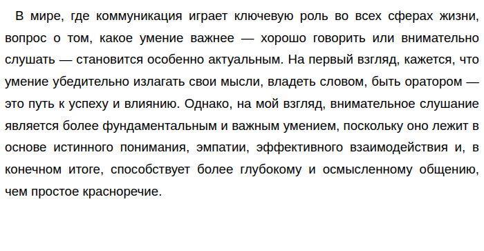 Во-первых, внимательное слушание позволяет по-настоящему понять собеседника, его мотивы, чувства и скрытые смыслы, что является основой для построения доверительных отношений и решения конфликтов. Человек, который только говорит, но не слушает, рискует остаться непонятым, а его слова — неуслышанными. Истинное общение — это не монолог, а диалог, где каждая сторона чувствует себя услышанной и понятой. Ярким примером значимости внимательного слушания является образ Сони Мармеладовой из романа Ф. М. Достоевского «Преступление и наказание». Когда Родион Раскольников, терзаемый муками совести после убийства, приходит к ней, он не ищет советов или морализаторства. Он ищет того, кто сможет его выслушать, понять его боль, не осуждая. Соня не обладает красноречием, она не произносит длинных речей, но она умеет слушать. Её слушание — это не пассивное восприятие звуков, а активное, эмпатическое погружение в душу собеседника. Она слушает Раскольникова с глубочайшим состраданием, принимает его исповедь, не отворачивается от него, несмотря на ужас его преступления. Именно её способность внимательно слушать, видеть в нем человека, а не только преступника, становится для Раскольникова спасительной соломинкой. Это слушание, полное любви и веры, помогает ему начать путь к покаянию и возрождению, чего не смогли бы сделать никакие самые убедительные слова или проповеди. Во-вторых, умение внимательно слушать демонстрирует уважение к собеседнику, способствует его раскрытию и позволяет получить ценную информацию, которая может быть использована для принятия более взвешенных решений или для саморазвития. Человек, который чувствует, что его слушают, склонен быть более открытым и искренним, что обогащает процесс общения для обеих сторон. Примером, хоть и косвенным, но показательным, может служить образ Платона Каратаева из романа Льва Николаевича Толстого «Война и мир». Каратаев — простой крестьянин, не обладающий выдающимися ораторскими способностями. Его речь проста, часто состоит из пословиц и поговорок. Однако он обладает удивительной способностью к жизни, к принятию мира таким, какой он есть, и к гармонии. Пьер Безухов, оказавшись в плену, в глубочайшем кризисе, находит в Каратаеве утешение и мудрость. Каратаев не учит Пьера, не произносит длинных монологов, но он живет, и его жизнь, его отношение к миру, его способность слушать и чувствовать, становятся для Пьера источником глубоких откровений. Пьер, сам будучи интеллектуалом и философом, умеющим хорошо говорить, учится у Каратаева не словам, а умению жить, чувствовать, быть частью целого. Это происходит не через наставления Каратаева, а через его присутствие, его способность быть, слушать и принимать. Каратаев, по сути, "слушает" жизнь, и Пьер, внимательно наблюдая за ним, учится этому. В заключение, хорошо говорить, безусловно, важно. Это инструмент для выражения мыслей и влияния. Однако без умения внимательно слушать оно становится пустым звуком, монологом, не способным создать истинную связь. Внимательное слушание — это основа понимания, эмпатии, уважения и мудрости. Оно позволяет не только понять другого, но и лучше понять себя, обогатиться чужим опытом и построить более глубокие и значимые отношения. Поэтому я убежден, что умение внимательно слушать является более важным и ценным в арс