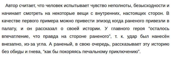 ![]() Понятно, что раненый не держит сильного зла на обидчика и в глазах главного героя тот уже готов его простить. В качестве второго аргумента я приведу эпизод, когда приехал доктор и “осторожно и мягко пытался внушить раненому сострадание к судьбе обидчика”. Он описал ситуацию, что у товарища, наносившего удар есть семья, дети и ему необходимо ухаживать и обеспечивать их и предложил 2 варианта: “по закону” или “по человечеству”. Все в палате ожидали услышать от раненого второй вариант решения, ведь ранее он сам давал понять, что зла на обидчика не держит. Но после того, как он выбрал решать дело по закону, то главный герой “был так взволнован, что не вытерпел и ушёл на двор”. Эти примеры противопостовляют друг друга. В первом эпизоде раненый даёт понять своим сопалатникам что не держит зла на обидчика, и как бы готов обойтись простыми извинениями. Но во втором эпизоде он же, несмотря на сложную судьбу товарища выбирает решать с ним проблемы по закону. Все ожидали от него, что раненый простит его, но тот выбрал другой вариант. Я согласен с мнением автора. Действительно, твои внутренние идеалы меняются, когда ожидание не совпадает с реальностью. Я могу привести пример из своей личной жизни: мой товарищ, после словесной перепалки с его одноклассником полез с ним в драку и нанёс ему телесные увечия. С точки зрения морали виноват сам одноклассник, ведь он его провоцировал, но по закону виноват мой товарищ. Вскоре на моего товарища было написано заявление в полицию, но после разговора родителей товарища и его одноклассника его отозвали. После мой стал менее восприимчив к оскорблениям, стал больше времени проводить дома и перестал общаться с этим одноклассником. Он действительно изменил свои мировоззрения и идеалы в жизни. Таким образом действительно, когда идеальные представления человека сталкиваются с реальной жизнью, то человек меняется, начинает смотреть на вещи с новой стороны, со стороны реального мира. Обновлено: Опубликовал(а): Jumaisumba Внимание! Спасибо за внимание. Полезный материал по теме