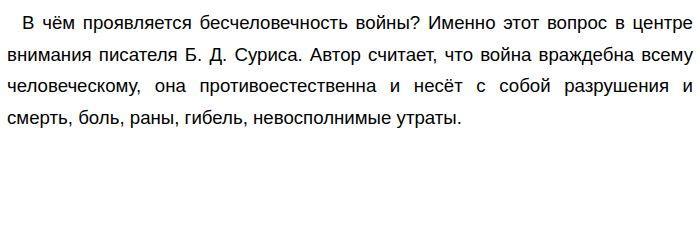 В чём проявляется бесчеловечность войны? По тексту Б. Д. Суриса «Семнадцать, восемнадцать, девятнадцать…» Дощинский 2026 45 вариант (ЕГЭ по русскому)![]() Это противоестественное всему человеческому существу событие уничтожает прекрасные мечты и надежды на лучшую жизнь. Раскрывая свою позицию, автор ведёт повествование от первого лица. Рассказчик повествует о том, как громада фашистских истребителей и бомбардировщиков неслась на советских солдат, которые казались такими маленькими и беззащитными по сравнению с огромными машинами смерти, и у них нет ничего для спасения, кроме ненадёжной окопной щели, залитой дождевой водой. Таким образом, используя антитезу, автор противопоставляет бомбардировщики, несущие смерть, и маленьких людей, которые могут в любую секунду погибнуть под снарядами и бомбами. Бесчеловечность войны проявляется в том, что немецкие асы, летящие уничтожать советских бойцов, чувствуют своё превосходство и безнаказанность, готовясь сбросить бомбы на людей. ![]()