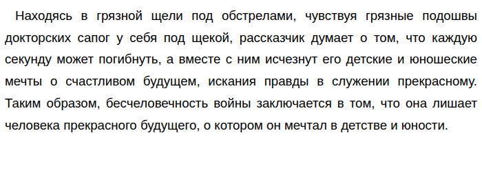 Оба примера имеют причинно-следственную связь. Сначала автор изображает не меньше полусотни фашистских бомбардировщиков, которые готовы сбросить бомбы на беззащитных людей, которые не могут противостоять машине смерти с помощью автоматов, и противопоставляет страшным механизмам ненадёжную щель. И, как следствие, нарастающий рокот вражеских самолётов, вызывает в рассказчике чувство близости смерти, его мысли о утраченных и разрушенных мечтах. Позиция автора мне близка. Действительно, война жестока и бесчеловечна, противна человеческому естеству и разуму, несёт горе, смерть и разрушения. Для подтверждения верности своей позиции приведу пример из рассказа М. А. Шолохова «Судьба человека». Война принесла неисчислимые страдания главному герою Андрею Соколову. Во время выполнения боевого задания он попал под вражеский артиллерийский обстрел, потерял сознание, а затем попал в плен, где ему приходилось выполнять тяжёлый физический труд в каменоломнях, терпеть издевательства и унижения фашистов. Война отняла у него самое дорогое — семью, лишила его радости надежд. В заключение хочу подчеркнуть, что люди должны задуматься о том, как много горя приносит война. Нужно бороться за мир на всей планете. «Люди Земли! Убейте войну!». Обновлено: Опубликовал(а): Vladimirovna Внимание! Спасибо за внимание. Полезный материал по теме