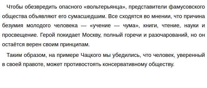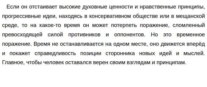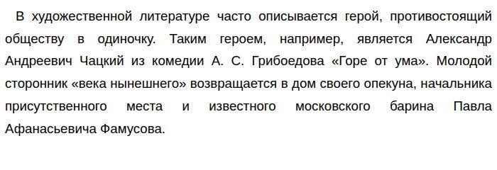 Как вы считаете, может ли один человек противостоять обществу? Аргументы А. С. Грибоедов «Горе от ума», А. П. Платонов «Юшка» (Итоговое сочинение (декабрьское))Известная русская пословица гласит: «Один в поле не воин». Но с этой народной мудростью можно поспорить. Как мне кажется, и один человек способен бороться с укоренившимися предрассудками и архаичными устоявшимися взглядами, может противостоять доминирующей социальной среде при определённых условиях и определённых нравственных качествах. ![]()