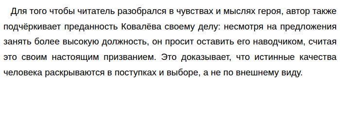 В тексте авторская позиция выражена косвенно. Писатель не выражает прямо свою позицию, но подводит читателя к мысли о том, что истинные качества человека раскрываются только при более близком знакомстве и в деле, а первое впечатление часто бывает неверным или неполным. Раскрывая проблему, Катаев обращает внимание читателя на наводчика Ковалёва, который на первый взгляд не соответствует представлению о герое: немолодой, добродушный, с “гражданской” внешностью, вызывавший недоверие у окружающих. Однако в бою он проявляет себя как гениальный профессионал, мужественный герой, стойкий и преданный делу. Автор показывает, что нельзя судить человека по внешности, только его поступки раскрывают истинную суть. ![]()
