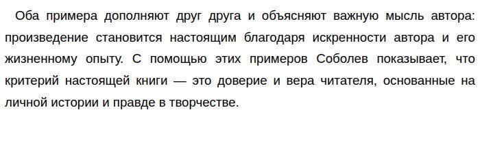 Раскрывая проблему, Андрей Николаевич Соболев обращает внимание читателя на значимость искренности и правдивости в литературе. Он подчёркивает, что доверие к автору — важнее художественных приёмов и красок. Так, он приводит примеры выдающихся личностей — Маяковского, Высоцкого, Визбора, Солженицына и Шаламова — чьи жизненные испытания и поступки усиливали силу их произведений. Например, он отмечает, что «Знаменитое ‘Не верю!’ Станиславского проникает сейчас во все жанры и виды искусства», показывая, что ложь сразу выявляется на страницах книг, требующих доверия читателя. По моему мнению, этот пример говорит о том, что настоящая литература должна быть основана на правде и глубоком личном опыте автора. Для того чтобы читатель понял взгляд автора, писатель подчёркивает, что биография, как её понимали раньше, оживляла образ автора и увеличивала доверие к нему. В предложении 27 он называет конкретных авторов, чьи тексты становились убедительными аргументами в спорах и им верили. Автор уверен, что настоящая литература — это голос жизни, подтверждённый личной историей. ![]()