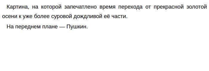 По картине «Осенние дожди» В. Попкова (Школьные сочинения)![]() Он одет в строгий черный костюм, полы его сюртука развеваются на ветру. Он стоит, прислонившись боком к колонне на деревянной веранде и задумчиво смотрит на осенний пейзаж. На полу за ним пролетают опавшие золотые листочки, выстроенные в линию, как будто перематывая время на картине. Весь средний план картины — это одетые в золото деревья, растущие по обе стороны от крыльца. Их широкие листья треплет холодный ветер и дождь, создавая хаос в ветвях. Далее, чуть извиваясь, протекает небольшая река, отсветы на которой уже отдают зимними красками. А за ней множество холмов с полями, разноцветье и разнообразие которых указывает на то, что выращиваются там разные культуры. А сверху распростерлось холодное и тяжелое серое небо с кляксами таких же облаков. Действительно, последние дни очаровательной поры прежде, чем очень станет совсем унылой. На мой взгляд, это восхитительная картина, очень атмосферная, при взгляде на нее как будто даже чувствуется промозглый ветер. Художнику Виктору Ефимовичу Попкову не удалось завершить картину "Осенние дожди. Пушкин", потому что его жизнь рано оборвалась, от выстрела — как и у А. С. Пушкина. Но ему удалось реалистично показать двух героев — великого поэта и осень. Александр Сергеевич узнаваем с первого же взгляда. Глядя на окружающую его красоту природы и буйство осени, он задумался. Он стоит на большой веранде, часть которой видна на картине. Его взгляд устремлен куда-то вдаль, лицо расслабленное. Думаю, что он просто наслаждается этой непредсказуемой осенью. Слабый, осенний, но ещё тёплый ветер срывает уже золотую листву и бросает её под ноги. Небо пасмурное, но вполне дружелюбное, не хочется скрыться в теплом помещении. Эта пора прекрасна. Именно осенью чаще задумываешься о жизни, о прошлом. Именно в это время года рождаются у великих мастеров удивительные по своей красоте и глубине картины, произведения. Обновлено: Опубликовал(а): Галина Горбунова Внимание! Спасибо за внимание.