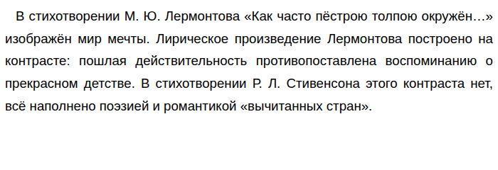 У Стивенсона реальный мир — это взрослые, сидящие вечером вокруг лампы за большим столом. Обстановка уютная, умиротворяющая. Вымышленная действительность связана с воображением мальчика, начитавшегося приключенческих книг об индейцах. Между двумя мирами нет противостояния, один мир дополняет другой красотой и поэзией. Герой же Лермонтова, находясь в маскарадной толпе, видя, «приличьем стянутые маски», чувствует лицемерие и пошлость светского общества. В нём возникает желание увидеть иной мир, он погружается в мечту, видит себя ребёнком в барской усадьбе, слышит шорох листьев на аллее и ласковый женский голос. Оба героя по-разному возвращаются в реальность из мира мечты и воображения. Субъект переживания Р. Л. Стивенсона слышит, как няня зовёт его спать, очарование вычитанных стран исчезает, и мальчик чувствует печаль и сожаление. Совсем иные переживания охватывают героя М. Ю. Лермонтова. Очнувшись от приятных и благостных воспоминаний, он снова видит себя в пошлой маскарадной толпе, и в нём возникает чувство протеста, желание бросить в лицо лицемерным и пустым людям «железный стих, облитый горечью и злостью». Таким образом, герои Стивенсона и Лермонтова по разным причинам погружаются в мир мечты и испытывают разные чувства, вернувшись в реальность. Обновлено: Опубликовал(а): Vladimirovna Внимание! Спасибо за внимание. Полезный материал по теме