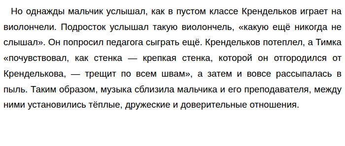 После этого случая, когда Тимка оказался из-за аппендицита в больнице, педагог стал навещать больного. Крендельков принёс мальчику плеер, «закачал туда виолончельной музыки». Учитель не хитрил, как несправедливо думал Тимка, он «просто делился музыкой, которую любил сам». Подросток полюбил виолончель, а повзрослев, он стал виолончелистом. Становится ясно, что музыка, игра на виолончели изменили музыкальные вкусы мальчика, он полюбил этот музыкальный инструмент и свою будущую профессию связал именно с этим музыкальным инструментом. Данные примеры из текста имеют причинно-следственную связь. Услышав проникновенную игру своего педагога на виолончели, герой изменил отношение к этому инструменту, а впоследствии связал свою музыкальную деятельность именно с виолончелью. Позиция автора мне близка, и я полностью её поддерживаю. Несомненно, музыка способна изменить человека к лучшему, помочь ему преодолеть отрицательные эмоции и сблизиться с человеком, которого раньше не понимал и не принимал. Для подтверждения верности своей позиции приведу пример из романа И. А. Гончарова «Обломов». Главный герой слушает арию в исполнении Ольги Ильинской. Он поражён искусством её исполнения, взволнован, растроган, по его щекам текут слёзы, и неожиданно для самого себя он признаётся девушке в любви. В заключение хочу подчеркнуть, что музыка облагораживает человека, вдохновляет его на любовь, на дружбу, на добрые поступки, объединяет людей, устраняет между ними вражду, непонимание. Обновлено: Опубликовал(а): Vladimirovna Внимание! Спасибо за внимание. Полезный материал по теме
