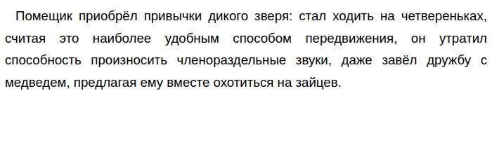 4.2 Как название произведения — «Дикий помещик» — связано с содержанием приведённого фрагмента? Зинин 2025 1 вариант (ЕГЭ по литературе)Название сказки М. Е. Салтыкова-Щедрина «для детей изрядного возраста», сочетающей в себе элементы фантастики, сатиры и фольклора, — «Дикий помещик» самым тесным образом связано с содержанием приведённого фрагмента, так как в данном отрывке представлен процесс одичания помещика. Для этого автор использует портрет помещика, а портретные детали противопоставляются, создавая антитезу. Кроме описания изменений внешнего вида одичавшего героя, автор описывает его поведение, привычки, рассказывает о дружбе с медведем. В портрете помещика применяется антитеза, создаваемая с помощью эпитетов, сравнений и художественных деталей. Так, раньше у героя тело было «рыхлое, белое, рассыпчатое». Эти эпитеты указывают на то, что раньше, когда в имении были крестьяне, «русский дворянин Урус-Кучум-Кильдибаев» нежил своё холёное тело, ни о чём не заботился, получал всё стараниями крепостных. С исчезновением крестьян помещик одичал, «весь он, с головы до ног, оброс волосами, словно древний Исав, а ногти у него сделались железные». Сравнение «как древний Исав» относит читателя к древнейшим временам, а сравнительный оборот «как кошка» указывает на то, что герой утратил человеческий облик, приобрёл привычки и повадки животных. ![]() Причём медведь оказался умнее помещика, называя его глупым, так как он зря уничтожил мужика, которого способнее есть. Таким образом, содержание приведённого фрагмента ярко иллюстрирует процесс одичания помещика м тесно связано с его содержанием, так как в нём описывается внешний вид, поведение и привычки героя. Обновлено: Опубликовал(а): Vladimirovna Внимание! Спасибо за внимание. Полезный материал по теме