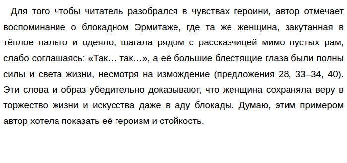 Оба примера из текста объясняют важную мысль автора: женщина достойна благодарности за способность охранять свет искусства и жизни в катастрофу, передавая его детям. Первый пример описывает её в мирное время как любящую мать, второй — в блокаду как хранительницу культуры. Так, эти примеры связаны по принципу противопоставления прошлого и настоящего, подчёркивая внутреннюю силу героини. Я полностью согласна с автором и считаю, что такая благодарность — это признание тихого героизма обычных людей, берегущих ценности в любые эпохи. В качестве примера-аргумента я могу привести историко-культурный опыт: во время Великой Отечественной войны многие люди, подобно героине Тэсс, спасали культурные сокровища. Например, в блокадном Ленинграде работники Публичной библиотеки под обстрелами перетаскивали редкие книги в укрытия, заделывали крышу, голодали, но не дали нанести ущерб искусству. Так, их усилия обеспечили культурную преемственность для поколений. Таким образом, позиция автора учит ценить и мысленно благодарить тех, кто хранит свет жизни и искусств. . Обновлено: Опубликовал(а): Мыша_Пишет Внимание! Спасибо за внимание. Полезный материал по теме