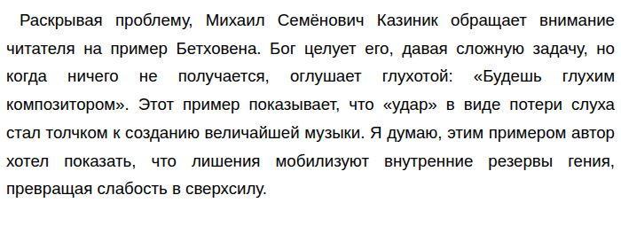 Что способствует мобилизации творческих сил гениального человека? По тексту М. С. Казиника «У меня есть теория, называется она «теория поцелуя и удара» (ЕГЭ по русскому)В приведённом тексте известного лектора-музыковеда Михаила Семёновича Казиника ставится проблемный вопрос: Что способствует мобилизации творческих сил гениального человека? Позиция автора чётко выражена. Он убеждён, что для мобилизации творческих сил гения необходимы не только талант и поцелуй Бога в виде миссии, но и «удар» — тяжёлые испытания вроде болезней, страхов или одиночества, которые заставляют сосредоточить все силы на творчестве. ![]()