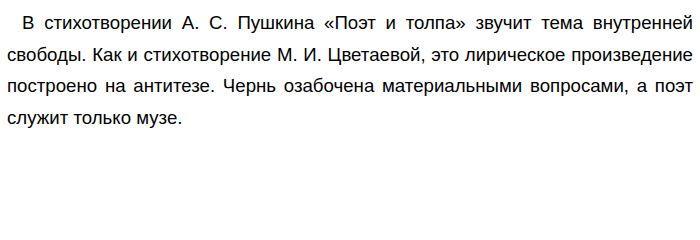 В лирическом произведении Пушкина представлен диалог поэта и черни. «Непосвящённый народ» требует, чтобы «вдохновенный певец» служил им, своим творчеством исправляя человеческие пороки. Но певец дорожит внутренней свободой, он рождён «не для толпы», а «для звуков сладких и молитв». Лирическая героиня М. Цветаевой обладает внутренней свободой, она находится «непрестанно в полёте», не приемлет толпы, созданной из гранита и глины. Для неё высшая ценность — свобода духа. Таким образом, А. С. Пушкин и М. И. Цветаева создают художественные образы, в которых главное — свобода духа, они не хотят подчиняться толпе с её низменными интересами. Обновлено: Опубликовал(а): Vladimirovna Внимание! Спасибо за внимание. Полезный материал по теме