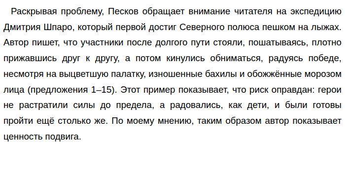 Стоит ли рисковать своей жизнью ради новых открытий? По В. М. Пескову «Здесь полюс, поздравляю вас, ребята!» (ЕГЭ по русскому)В приведённом тексте известного советского журналиста, писателя, фотокорреспондента, путешественника и телеведущего Василия Михайловича Пескова ставится проблемный вопрос: Стоит ли рисковать своей жизнью ради новых открытий? Позиция автора чётко выражена. Он убеждён, что рисковать жизнью ради открытий стоит, поскольку именно смельчаки, преодолевающие опасности, расширяют знания о мире и оставляют след в истории, в отличие от пассивных наблюдателей. ![]()