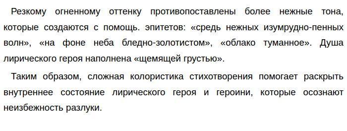 4.2 Как цветовая гамма стихотворения передаёт внутреннее состояние лирического героя? 10. Назовите стихотворение, которое посвящено теме любви. Сопоставьте выбранное Вами произведение со стихотворением А. Белого Зинин 2025 4 вариант (ЕГЭ по литературе)4.2 Внутреннее состояние лирического героя стихотворения Андрея Белого «Любовь» передаёт сложная цветовая гамма: ярко-красные, багровые тона создают тревожное настроение, передают отчаяние героев, которые осознают, что расстаются навсегда, а нежный, светлый, бледный колорит раскрывает печаль возлюбленных, символизирует уходящее счастье, которое не вернуть, смирение перед неизбежностью разлуки, создают элегические мотивы, ностальгию. Во второй строфе эпитет «пунцовый», метафора «пламенем», цветовой глагол «зарделись» - яркие изобразительно-выразительные средства, направленные на то, чтобы создать мотив напряжённого ожидания, расставания героев. Красный цвет символизирует страсть и горечь разлуки. ![]()