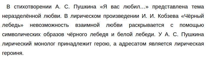 И. И. Кобзев использует антитезу, раскрывая тему неразделённой любви, чтобы показать, почему не суждено героям быть вместе. Они прямо противоположны, как день и ночь, которые сменяют друг друга, но никогда не встретятся. Субъекта высказывания глубоко трогает история о том, «как печальный лебедь чёрный // Лебедь белую любил». Он оценивает отрицательно возможность совместного счастья между антиподами, обитающими в разном пространстве и времени, поэтому утверждает, что «чёрный лебедь» — «чудак», «зря мечтал» о белой лебеди. Ночь и день несовместимы, поэтому героям печальной истории «в небе рядом не летать». В стихотворении А. С. Пушкина «Я вас любил…» тема неразделённой любви раскрывается с помощью лирического монолога. Субъект переживания обращает свою речь к возлюбленной, которую он любил «безмолвно, безнадежно». Он хочет освободиться от этого чувства, чтобы ничем не печалить возлюбленную, так как понимает, что его чувство не найдёт отклика в её душе, но он думает не о себе, а душевном спокойствии и счастье любимой, поэтому желает ей счастья с другим. Таким образом, в стихотворениях А. С. Пушкина и И. И. Кобзева тема неразделённой любви раскрывается разными художественными средствами. Кобзев использует символические образы чёрного лебедя и белой лебеди, антитезу. Пушкин применяет лирический монолог, в котором есть субъект высказывания и адресат – возлюбленная, к которой обращает свою речь герой. Обновлено: Опубликовал(а): Vladimirovna Внимание! Спасибо за внимание. Полезный материал по теме