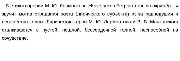 Герой Лермонтова находится на маскараде, видит перед собой вместо лиц «приличьем стянутые маски», к нему подходят и касаются его «давно бестрепетные руки». Чтобы преодолеть отчаяние, субъект высказывания погружается в воспоминания детства, видит родную усадьбу, слышит шелест листвы на аллее и знакомый женский голос. Но, очнувшись, он видит перед собой равнодушную, невежественную толпу, и в нём возникает желание бросить толпе в лицо «железный стих, облитый горечью и злостью». Лирический субъект В. Маяковского находится в толпе музыкантов. Оркестр равнодушен к переживаниям скрипки. А когда герой проявляет сочувствие по отношению к плачущей скрипке, он вызывает смех у грубой, бесчувственной толпы, которая, издеваясь, говорит, что он «влип», «пришёл к деревянной невесте». Таким образом, герои Лермонтова и Маяковского страдают из-за одиночества и непонимания, равнодушия и невежества толпы. Обновлено: Опубликовал(а): Vladimirovna Внимание! Спасибо за внимание. Полезный материал по теме