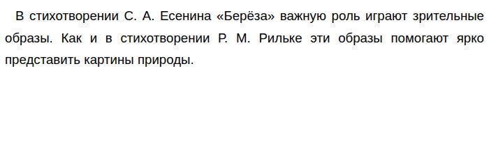 В лирическом произведении С. А. Есенина «Берёза» изображена зимняя белая берёза, растущая под окном лирического героя. Чтобы создать зрительный образ этого дерева, поэт использует художественные детали и метафоры: пушистые ветки, снежная кайма, белая бахрома. Эти выразительно-изобразительные средства позволяют представить берёзу, покрытую инеем, занесённую снегом. Р. М. Рильке, создавая вечернюю картину, использует следующие зрительные образы: закат; солнце, покидающее сад; деревья по краям дорог. Для создания зрительных образов он использует олицетворение: «Деревья жмутся по краям дорог»; «… солнце, покидая сад, // должно ещё раз оглянуться…»; гиперболу: «земле мала околица, // она переросла себя и стала больше небосвода». Таким образом, зрительные образы в стихотворениях С. А. Есенина и Р. М. Рильке помогают полнее и ярче представить художественный мир поэтов. Обновлено: Опубликовал(а): Vladimirovna Внимание! Спасибо за внимание. Полезный материал по теме