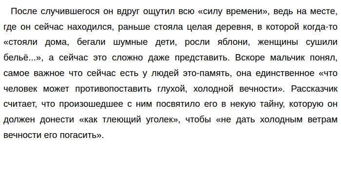 Почему важно ценить каждый момент времени? По Р. С. Савинову «В детстве я зачитывался книжками про индейцев и страстно мечтал жить где-нибудь в прериях, охотиться на бизонов, ночевать в шалаше…» (ЕГЭ по русскому)«Почему важно ценить каждый момент времени?» — на этот важный вопрос Роман Сергеевич Савинов отвечает в предоставленном тексте. Автор считает, что мы должны особенно относиться к каждому моменту нашей жизни, потому что всё в ней не вечно и единственное наше оружие против вечности, которая спустя года стирает наше существование, это память. Обратимся к тексту для подтверждения авторской позиции. В тексте рассказчик повествует о том, как летом, во время своего приключения встретил дедушку, который вдруг «ни с того ни с сего заплакал», а всё из-за того, что на месте, где тогда находились герои рассказа, раньше стояла деревня, из которой вскоре «все уехали, никого не осталось». Смотря на знакомые места, лишившиеся былой жизни, старик не смог сдержать слез, что заставило рассказчика задуматься о скоротечности времени. Этот пример показывает, как случайные события в нашей жизни способны натолкнуть нас на важные мысли, так автор говорит нам о важности и особенности каждого момента. Далее, мальчик все больше погружается в недавно пришедшие к нему в голову мысли. ![]()