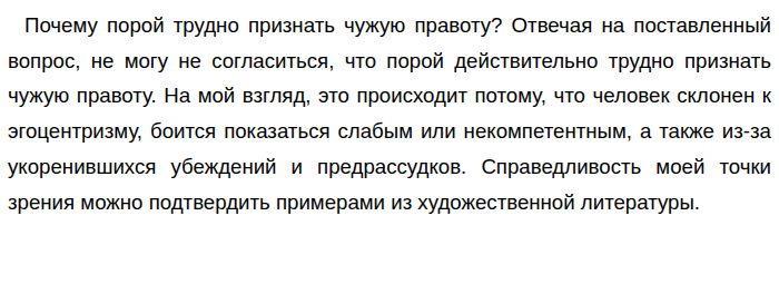 В одном из эпизодов в произведении А. С. Пушкина "Капитанская дочка" Пётр Гринёв, будучи молодым и неопытным офицером, отказывается признать правоту своего отца, который запрещает ему жениться на Маше Мироновой. Гринёв, ослеплённый любовью, не видит разумных доводов отца, считая его решение несправедливым и деспотичным. Он уверен в своей правоте и готов идти наперекор родительской воле, не задумываясь о последствиях. Несомненно, подобное отношение подтверждает, что молодому человеку порой трудно признать чужую правоту из-за юношеского максимализма и нежелания прислушиваться к более опытному мнению. Другим примером, который доказывает мою правоту, служит эпизод из романа Ф. М. Достоевского "Преступление и наказание". Родион Раскольников, совершив убийство старухи-процентщицы, долгое время не может признать свою вину и правоту следователя Порфирия Петровича. Он убеждён в своей "теории" о праве сильной личности на преступление и считает себя выше моральных норм. Раскольников упорно отрицает очевидные факты и пытается оправдать свои действия, не желая признавать, что его "правота" привела к трагическим последствиям. Подобная история свидетельствует о том, что человеку порой трудно признать чужую правоту из-за гордыни, ложных убеждений и нежелания столкнуться с суровой реальностью. Итак, размышляя над предложенной темой, я поняла, как важно развивать в себе способность к самокритике, умение слушать и анализировать чужие аргументы, а также быть готовым признать свои ошибки. Только так можно избежать многих конфликтов и прийти к взаимопониманию. Обновлено: Опубликовал(а): Мыша_Пишет Внимание! Спасибо за внимание. Полезный материал по теме