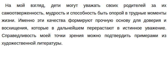 За что дети могут уважать своих родителей? Аргументы А. С. Пушкин «Капитанская дочка», А. П. Чехов «Ванька» (Итоговое сочинение (декабрьское))За что дети могут уважать своих родителей? Отвечая на поставленный вопрос, не могу не согласиться, что уважение к родителям — это глубокое и многогранное чувство, которое зарождается в сердце ребенка благодаря множеству факторов. ![]()