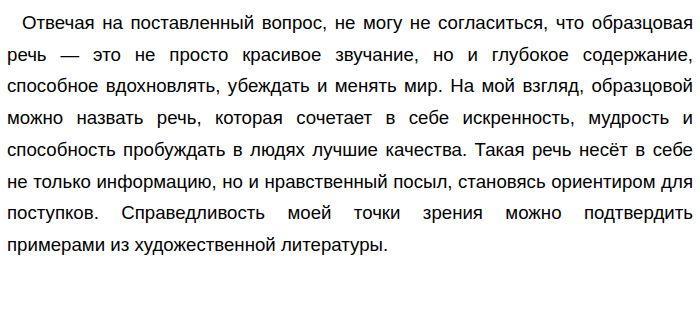 В одном из эпизодов в произведении А. С. Пушкина "Капитанская дочка" Пётр Гринёв демонстрирует образцовую речь, когда, оказавшись перед лицом смерти, отказывается присягать Пугачеву. Его слова, полные достоинства и верности своим принципам, звучат не как вызов, а как тихое, но твердое заявление о своей чести. Гринёв не прибегает к угрозам или мольбам, его речь проста и искренна, но именно эта простота и непоколебимость делают её столь сильной. Несомненно, такая история, где герой отстаивает свои убеждения, подтверждает, что образцовая речь — это речь, идущая от сердца и основанная на твёрдых нравственных принципах, способная противостоять любым испытаниям. Другим примером, который доказывает мою правоту, может служить речь Сократа, описанная в диалогах Платона. Сократ, известный своим методом майевтики, не стремился к эффектным выступлениям, его речь была направлена на пробуждение мысли и самопознания у собеседника. Он задавал вопросы, которые заставляли людей задуматься над истинным смыслом понятий, таких как справедливость, добродетель, знание. Его речь, лишенная «пафоса», но наполненная глубокой мудростью и стремлением к истине, служила образцом для многих поколений. Подобная история, где речь используется как инструмент для поиска истины и нравственного совершенствования, свидетельствует о том, что образцовая речь — это речь, которая не только убеждает, но и воспитывает, побуждая к размышлениям и самоанализу. Итак, размышляя над предложенной темой, я поняла, как важно, чтобы речь, будь то речь известного человека или литературного героя, была не только красноречивой, но и наполненной глубоким смыслом, искренностью и нравственной силой. Образцовая речь — это та, которая способна вдохновлять на добрые дела, пробуждать лучшие чувства и вести к истине. Обновлено: Опубликовал(а): Мыша_Пишет Внимание! Спасибо за внимание. Полезный материал по теме