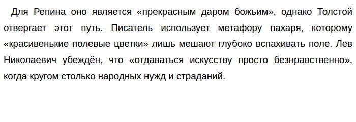 В чём заключается истинное предназначение человека и как искусство соотносится с нравственным долгом перед обществом? По тексту И. Е. Репина «В 1880 году в Москве, в Большом Трубном переулке, в моей мастерской под вечер всё вдруг приняло…» (ЕГЭ по русскому)В чём заключается истинное предназначение человека и как искусство соотносится с нравственным долгом перед обществом? Именно эту сложную этическую проблему поднимает великий русский художник И. Е. Репин в предложенном тексте, описывая свои встречи и беседы с Львом Николаевичем Толстым. Раскрывая проблему, автор знакомит нас с образом Толстого не как «своеобразного барина», а как «страстного деятеля» и «убеждённого проповедника». Репин подчёркивает силу воздействия речей писателя, который говорил о «вопиющем равнодушии нашем ко всем ужасам жизни» и о потере совести в несправедливости к «меньшим братьям». Лев Николаевич обличал обыденность и призывал к глубокому покаянию, что вызывало у художника сильное волнение и даже бессонницу. Этот пример показывает, что для Толстого первостепенным был вопрос моральной ответственности человека за всё происходящее в мире. Продолжая рассуждение, автор описывает конфликт взглядов на искусство. ![]() Второй пример иллюстрирует радикальную позицию Толстого: искусство не имеет права на существование, если оно не служит прямому социальному и нравственному преображению жизни. Приведённые примеры дополняют друг друга: первый раскрывает общую нравственную платформу Толстого, его требование совести, а второй — его конкретное, суровое отношение к искусству как к чему-то второстепенному и даже мешающему серьезному труду. Позиция автора текста, И. Е. Репина, выражена через его преклонение перед личностью Толстого, но при этом он сохраняет верность искусству. Репин считает его «даром божьим», в то время как Лев Толстой убеждён: в «серьёзное время» искусство — это лишь «сорняки» на поле, которое нужно пахать ради блага народа. Автор даёт нам понять, что Толстой ставит этику и служение людям выше эстетического наслаждения. Я разделяю беспокойство Толстого о равнодушии общества, однако не могу полностью согласиться с его отрицанием искусства. Мне кажется, что искусство не всегда является «цветами на поле», оно само может быть тем самым плугом, который вспахивает человеческие души. Настоящие произведения способны пробуждать в людях ту самую совесть, о которой говорил писатель. Например, картины художников-передвижников, к которым принадлежал и сам Репин, открывали обществу глаза на страдания простого народа не менее эффективно, чем пламенные проповеди. В заключение хочется сказать, что встреча двух гениев — Толстого и Репина — это вечный спор о том, что важнее: красота или польза. Текст убеждает нас в том, что любой творческий путь должен быть освещён светом совести и осознанием ответственности перед людьми. Только тогда жизнь и деятельность человека обретают подлинный смысл. Обновлено: Опубликовал(а): margaritakurinova Внимание! Спасибо за внимание. Полезный материал по теме