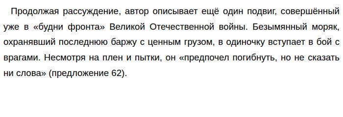 ![]() Автор делает акцент на том, что «никто не знал и не узнает его имени». Этот пример иллюстрирует важную мысль: величие подвига не зависит от того, станет ли имя героя известным. Истинный патриотизм бескорыстен, он проявляется в готовности исполнить долг до конца, даже оставаясь в безвестности. Приведённые примеры дополняют друг друга: первый случай демонстрирует коллективную волю моряков к защите чести флага, а второй — личное мужество и верность присяге отдельного бойца. Вместе они убеждают нас в том, что дух самопожертвования является неотъемлемой чертой русского народа на протяжении всей истории. Позиция автора выражена ясно: Новиков-Прибой убеждён, что в основе любого выдающегося подвига лежит «несокрушимая нравственная сила» и «великая всеобъемлющая любовь к родине». Автор проводит параллель между античным героем Муцием Сцеволой и русскими моряками, доказывая, что героический дух бессмертен и не знает временных границ. Я полностью согласен с позицией автора. Настоящий героизм — это не минутный порыв, а результат твердости духа. Человек, любящий свою землю, в решающий момент просто не может поступить иначе. Вспомним повесть Б. Л. Васильева «А зори здесь тихие…». Пять молодых девушек во главе со старшиной Васковым вступают в неравный бой с немецкими диверсантами. Они погибают, защищая стратегически важный объект, но не отступают. Их подвиг, как и подвиг героев из текста Новикова-Прибоя, продиктован чувством ответственности за судьбу своей страны. В заключение хочется сказать, что память о героях, как прославленных, так и безымянных, — это то, что объединяет поколения. Текст А. С. Новикова-Прибоя напоминает нам: пока в людях живет «всеобъемлющая любовь к Родине», наш народ остается непобедимым. Обновлено: Опубликовал(а): margaritakurinova Внимание! Спасибо за внимание. Полезный материал по теме