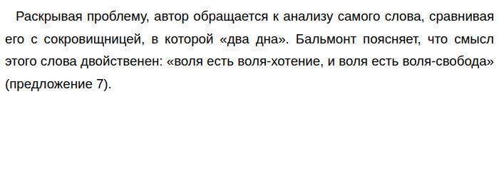 В чём заключается уникальность и многогранность русского слова? По тексту К. Д. Бальмонта «Из всех слов могучего и первородного русского языка, полногласного, кроткого и грозного, бросающего звуки взрывным водопадом, журчащего неуловимым ручейком…» (ЕГЭ по русскому)Какова связь между языком и душой народа? Почему некоторые слова становятся для нас особенно дорогими и всеобъемлющими? Именно над проблемой глубины и значимости слова «воля» в русском языке и сознании предлагает задуматься поэт и эссеист К. Д. Бальмонт. ![]() Автор подчеркивает, что в русском сознании эти два понятия — внутреннее стремление личности и внешнее безграничное пространство — неразрывно связаны. Этот пример показывает, что слово «воля» — это не просто лексема, а философская категория, объединяющая силу духа и жажду простора. Продолжая рассуждение, Бальмонт погружает читателя в мир народных преданий и стихий. Он упоминает «лешего», который, согласно народному слову, «нем, но голосист», и говорит о «воле» как о великой радости освобождения, понятной и ребенку, выпускающему птицу из клетки, и великому мудрецу. Автор описывает природу — рокот зверей, шепот травинок, гимн грома — как проявление «ищущей воли», стремящейся вырваться на простор (предложение 28). Этот пример иллюстрирует мысль о том, что «воля» в русском понимании — это живая стихия, роднящая человека со всем миром и космосом. Приведенные примеры дополняют друг друга: если первый раскрывает лингвистическое и смысловое богатство слова, то второй показывает его воплощение в жизни, фольклоре и природе. Вместе они позволяют автору доказать, что «воля» является ключевым понятием для понимания русского характера и мироощущения. Позиция автора ясна: К. Д. Бальмонт убежден, что из всего богатства русского языка именно слово «воля» является самым дорогим и всеобъемлющим. Для него оно — символ неразрывного единства человеческого желания и безграничной свободы, «талисман», в котором заключена основная тайна мира и русской души. Я полностью разделяю позицию автора. Слово «воля» действительно не имеет точных эквивалентов в других языках, потому что оно выражает не просто политическую или юридическую свободу, а состояние души, не знающей преград. ![]()