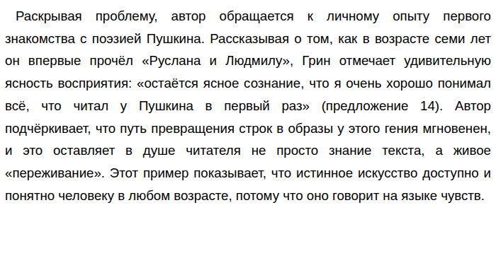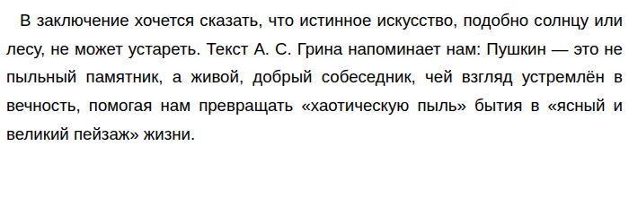 Приведённые примеры дополняют друг друга: если первый пример раскрывает внутренний механизм воздействия поэзии на отдельного читателя, то второй утверждает универсальность и вневременную ценность творчества поэта для всего человечества. Вместе они подводят к выводу о том, что Пушкин — это не просто литература, а неотъемлемая часть жизни и национального сознания. Позиция автора ясна: А. С. Грин считает, что А. С. Пушкин — это гений, чьё творчество находится вне времени. Для него имя поэта неразрывно связано с образом России и глубиной человеческой души. Пушкин «знал, что такое искусство», и смог воплотить в своих книгах самоё себя так полно и искренне, что его голос будет звучать современно всегда, пока существуют люди и их чувства. Я полностью согласен с позицией автора. Творчество Пушкина действительно является фундаментом нашей культуры. Его гений заключается в способности быть простым и глубоким одновременно. Недаром Аполлон Григорьев сказал: «Пушкин — наше всё». Мы до сих пор говорим на языке, который создал он, и ищем в его строках ответы на свои вопросы. Вспомним, например, как в годы тяжёлых испытаний люди всегда обращались к Пушкину: его стихи читали в блокадном Ленинграде, они давали силы жить и верить в победу. Это ли не лучшее доказательство его «современности»? ![]() Обновлено: Опубликовал(а): margaritakurinova Внимание! Спасибо за внимание. Полезный материал по теме