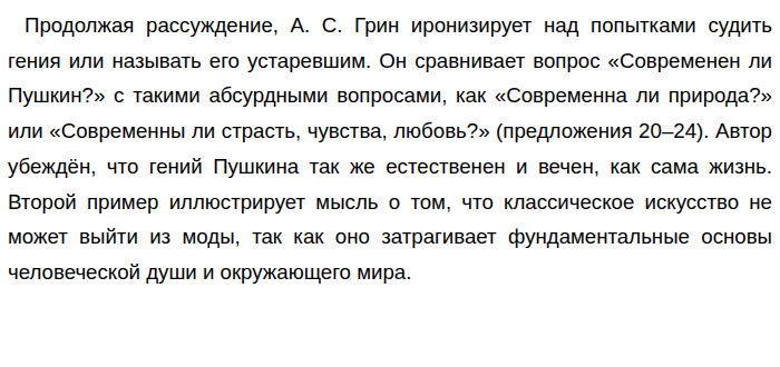 Почему произведения некоторых авторов не теряют своей притягательности спустя столетия? По тексту А. С. Грина «Сто двадцать пять лет очень немного на весах истинного искусства…» (ЕГЭ по русскому)Почему произведения некоторых авторов не теряют своей притягательности спустя столетия? Можно ли ставить под сомнение ценность подлинного искусства, объявляя его «несовременным»? Именно над проблемой непреходящего значения творчества А. С. Пушкина и природы его гениальности предлагает задуматься А. С. Грин в предложенном для анализа тексте. ![]()