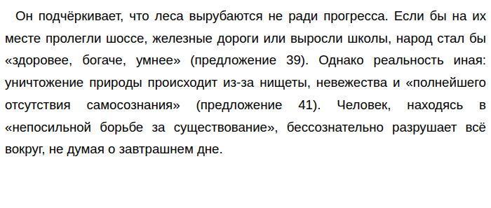 К чему приводит бездумное истребление природных богатств? По тексту А. П. Чехова «Добрый день!» (ЕГЭ по русскому)К чему приводит бездумное истребление природных богатств? Можно ли оправдать уничтожение лесов нуждами людей, если на месте вырубок не создается ничего нового? Именно эти важные вопросы поднимает А. П. Чехов в предложенном тексте, заставляя читателя задуматься о проблеме разрушительного влияния человека на окружающую среду. Раскрывая проблему, автор знакомит нас с доктором Астровым, который показывает Елене Андреевне свои картограммы. ![]() Этот пример иллюстрирует масштаб экологической катастрофы, произошедшей в отдельно взятом уезде по вине человека. Продолжая рассуждение, Астров анализирует причины этого процесса. ![]() Второй пример показывает, что экологический кризис — это прежде всего результат духовного и культурного упадка общества. Приведенные примеры дополняют друг друга: если в первом примере мы видим внешнюю картину постепенного вырождения природы, то во втором автор раскрывает глубинные социальные причины этого явления, указывая на отсутствие созидательного начала в действиях людей. Позиция автора выражена через горькие размышления Астрова. Чехов убеждён, что безжалостное истребление лесов и животных является свидетельством деградации человечества. Для писателя важно подчеркнуть: «разрушено уже почти всё, но взамен не создано ещё ничего» (предложение 42). Автор призывает к осознанному и созидательному отношению к миру, в котором мы живем. Я полностью согласен с позицией А. П. Чехова. Действительно, природа — это не просто ресурс, а основа нашей жизни. Когда человек уничтожает леса, не созидая ничего взамен, он обкрадывает будущие поколения и лишает себя будущего. В русской литературе эта тема звучит особенно остро. Вспомним, например, повесть Валентина Распутина «Прощание с Матёрой». Затопление острова ради строительства электростанции воспринимается героями как гибель их мира, их памяти и совести. Как и Чехов, Распутин показывает, что технический прогресс, лишенный нравственной основы и уважения к земле, превращается в варварство. В заключение хочется сказать, что текст А. П. Чехова звучит сегодня как никогда актуально. Он напоминает нам о том, что человек несет ответственность за каждый уголок земли. Мы должны помнить, что природа — это наш общий дом, и наша задача — не только пользоваться его дарами, но и беречь его красоту для тех, кто придет после нас. Обновлено: Опубликовал(а): GRETA2222 Внимание! Спасибо за внимание. Полезный материал по теме