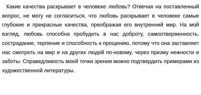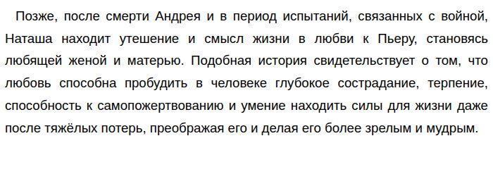 В одном из эпизодов в произведении А. И. Куприна "Гранатовый браслет" главный герой, Желтков, демонстрирует безграничную и самоотверженную любовь к Вере Николаевне Шеиной. Его любовь, безответная и безнадежная, раскрывает в нём удивительную способность к глубокому и искреннему чувству, которое не требует ничего взамен. Желтков, скромный чиновник, на протяжении многих лет тайно и преданно любит Веру, посылая ей письма и подарки, не ожидая ответных чувств. Его последним подарком становится гранатовый браслет, символизирующий его чистую и бескорыстную любовь. Когда Вера просит его прекратить преследования, Желтков, не желая причинять ей неудобства, принимает трагическое решение уйти из жизни, оставив прощальное письмо, в котором он благодарит её за то, что она была "единственной радостью в его жизни". Несомненно, такая история любви, полная самопожертвования и глубокой преданности, подтверждает, что любовь раскрывает в человеке способность к безграничной доброте, самоотверженности и готовности отдать всё ради счастья другого, даже если это счастье не связано с ним самим. Другим примером, который доказывает мою правоту, служит эпизод из романа Л. Н. Толстого "Война и мир", где любовь Наташи Ростовой к князю Андрею Болконскому и, позднее, к Пьеру Безухову, раскрывает в ней множество прекрасных качеств. В начале романа Наташа предстаёт перед нами как жизнерадостная, непосредственная и немного легкомысленная девушка. Однако её любовь к Андрею Болконскому, а затем и к Пьеру, преображает её. Когда Андрей тяжело ранен, Наташа проявляет невероятное сострадание и терпение, ухаживая за ним, несмотря на его тяжёлое состояние и её собственное горе. Она забывает о себе, полностью отдаваясь заботе о любимом человеке. ![]()