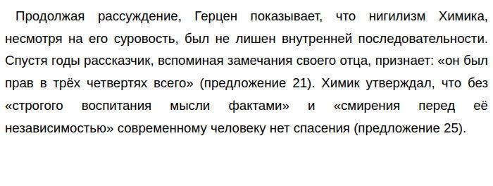 Насколько оправдано полное отрицание устоявшихся истин и общественных норм? По тексту А. И. Герцена «Об этом человеке носились странные слухи: говорили, что он был нелюдим, ни с кем не знался, вечно сидел один, занимаясь химией…» (ЕГЭ по русскому)Насколько оправдано полное отрицание устоявшихся истин и общественных норм? Всегда ли отказ от традиционных ценностей является формой невежества, или в нём есть своя, пусть и суровая, правда? Именно над проблемой нигилистического отношения к миру и его возможной оправданности предлагает задуматься А. И. Герцен в предложенном для анализа тексте. Раскрывая проблему, автор знакомит нас с образом «Химика», человека, который для своих родственников был чудаком, а для общества — «нелюдимым». Он отрицал философию, литературу, семейную жизнь и считал, что «эгоизм – исключительное начало всех действий» (предложение 8). Химик верил, что в человеке «так же мало лежит ответственности за добро и зло, как на звере» (предложение 15). Этот пример демонстрирует, что нигилистическое мировоззрение героя основано на рациональном, материалистическом взгляде, который не признает никаких высших ценностей, кроме фактов. ![]() Отказываясь от «мистического зерна», он спасал разум от заблуждений. Второй пример иллюстрирует, что нигилистический взгляд Химика, хотя и отвергает многие традиционные представления, является не просто пустословием, а результатом глубокого научного миропонимания, способного защитить человека от невежества и предрассудков. Приведенные примеры дополняют друг друга: первый раскрывает крайнюю степень отрицания героем традиционных ценностей, а второй — внутреннюю логику и некоторую оправданность его подхода с точки зрения научного мышления. Вместе они подводят к мысли о том, что нигилизм может быть не только разрушительным, но и очищающим, если в его основе лежит стремление к истине. Позиция автора текста амбивалентна: А. И. Герцен, хоть и был возмущён «материализмом» Химика, спустя годы признал его правоту во многом. Автор, будучи сам человеком прогрессивных взглядов, понимает, что нигилизм, основанный на науке, может быть необходимым этапом для очищения общества от устаревших догм и суеверий. Однако он всё же не принимает полного отрицания всего духовного. Я согласен с тем, что нигилизм, основанный на научном познании, может быть оправдан как способ борьбы с косностью и невежеством. Действительно, многие научные открытия требовали полного отрицания церковных догм и устаревших теорий. Однако я считаю, что абсолютный нигилизм, отвергающий не только предрассудки, но и такие понятия, как любовь, искусство, нравственность, неизбежно приводит к опустошению души. Вспомним Евгения Базарова из романа И. С. Тургенева «Отцы и дети». Его нигилизм, выражающийся в отрицании авторитетов, романтики и общепринятых норм, сначала кажется сильным и прогрессивным. Но в итоге он приводит героя к глубокому кризису и одиночеству, когда Базаров сам не может ответить на вечные вопросы жизни и любви. В заключение хочется сказать, что нигилизм — это сложное явление. Текст А. И. Герцена напоминает нам: хотя стремление к научной истине может требовать отказа от ложных представлений, полное отрицание духовного наследия человечества не способно привести к гармонии и счастью. Обновлено: Опубликовал(а): margaritakurinova В