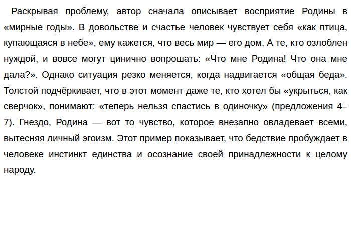 Как изменяется отношение к Родине во время бедствий? По тексту А. Н. Толстого «В мирные годы человек, в довольстве и счастье, как птица, купающаяся в небе, может далеко отлететь от гнезда и даже покажется ему, будто весь мир — его Родина…» (ЕГЭ по русскому)Что заставляет человека, ещё вчера равнодушного к судьбе своей страны, внезапно почувствовать неразрывную связь с ней? Почему именно в моменты великих потрясений любовь к отчему краю становится для нас главной ценностью? Именно над проблемой изменения отношения человека к Родине в годы национальных бедствий предлагает задуматься А. Н. Толстой в предложенном для анализа тексте. ![]()