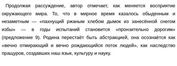 ![]() Второй пример иллюстрирует, что в годы бедствий любовь к Родине обретает глубину и историческую перспективу: человек осознаёт себя ответственным за сохранение того великого наследства, которое передали ему предки. Приведённые примеры дополняют друг друга: если первый демонстрирует переход от индивидуализма к народному единству, то второй раскрывает качественное изменение чувства патриотизма — от поверхностного пользования благами к глубокому, осознанному сопереживанию судьбе своей страны. ![]()