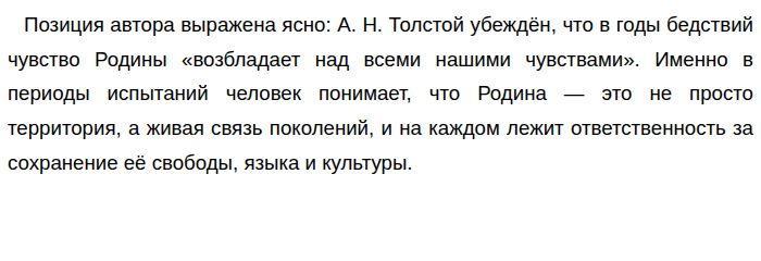 Я полностью согласен с позицией автора. Действительно, в спокойные времена мы часто принимаем мир и родной дом как должное. Но когда возникает угроза уничтожения нашего уклада, наших ценностей, любовь к Отечеству становится мощной силой, объединяющей миллионы. Вспомним события Великой Отечественной войны. Люди самых разных взглядов и судеб встали на защиту земли, которую они внезапно осознали как самое дорогое, что у них есть. В рассказе М. А. Шолохова «Судьба человека» главный герой Андрей Соколов выносит нечеловеческие испытания именно потому, что в его сердце живет образ родного дома, осознание своего долга перед памятью предков и будущим детей. Именно беда выявила тот стальной стержень патриотизма, который в мирной жизни был скрыт за повседневными заботами. В заключение хочется сказать, что истинная любовь к Родине, по мысли А. Н. Толстого, наиболее полно проявляется в способности человека разделить её судьбу в трудную минуту. Бедствия очищают наше восприятие, заставляя ценить «землю отчую и дренюю» как колыбель нашей души и основу нашего существования. Обновлено: Опубликовал(а): margaritakurinova Внимание! Спасибо за внимание. Полезный материал по теме