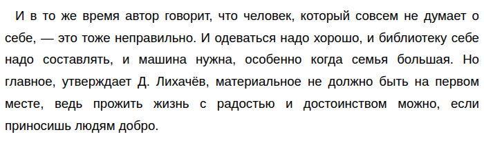 Должен ли человек отказываться от материальных ценностей? По тексту Д. Лихачёва «Когда человек сознательно или интуитивно выбирает себе…» (ЕГЭ по русскому)В своём тексте академик Д. Лихачёв рассуждает о главной жизненной задаче, о материальном и духовном в жизни, а также ставит вопрос, нужно ли отказываться от материальных ценностей. Свою точку зрения автор излагает ясно: от материальных благ отказываться не стоит. Но не нужно превращать их в «первостепенное». Автор убеждён, что главная жизненная цель должна быть продиктована любовью и добротой к людям, к стране. ![]()