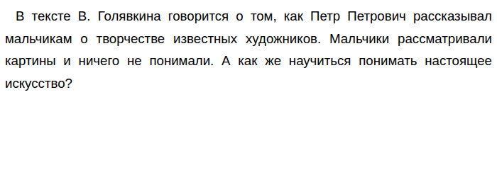 Пётр Петрович учился в Академии художеств. И даже во время блокады Ленинграда он вместе со своим учителем ходил в Эрмитаж смотреть картины великих мастеров. Вот и теперь Петр Петрович показывает ребятам картины в альбоме. Чтобы понимать произведения искусства, их нужно рассматривать. Кроме того, Петр Петрович интересно и эмоционально рассказывал о Рембрандте, Делакруа, Рафаэле и других художниках. Он объяснял ребятам, что и как изображали мастера, отмечал особенности их творчества. Значит, чтобы понимать настоящее искусство, нужно слушать специалиста в этой области, стараясь понять то, что он видит в картине. Таким образом, чтобы научиться понимать настоящее искусство, нужно внимательно рассматривать картины. И ещё нужно слушать мастеров, которые учат понимать истинные шедевры. Обновлено: Опубликовал(а): Антосюк Любовь Михайловна Внимание! Спасибо за внимание. Полезный материал по теме