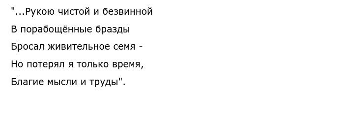 Раб понимал, что был обречен на смерть, но всё же "послушно в путь потёк и к утру возвратился с ядом". Моделируя данную ситуацию, мы приходим к понимаю того, что у раба не имелось никаких нравственных ценностей и его выбор был принят сквозь запугивание и унижения. Сбежать, и умереть не принося владыке смертоносную ветвь? Раб даже не рассматривает подобную перспективу, послушно отправляясь за ядом древа. Следующим аргументом, подтверждающим выдвинутый мною тезис, является очередное произведение А.С. Пушкина "Свободы сеятель пустынный...". Здесь Пушкин указывает на духовное рабство народа. Необразованные умы, лишённые всякого понимания политической обстановки в стране, достаточно легко "затуманить" простой агитацией: ![]()