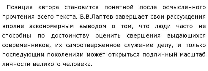по тексту В.В.Лаптева Когда размышляешь о судьбах великих людей, то поневоле начинаешь испытывать какое-то смешанное чувство (ЕГЭ по русскому)![]() Чтобы привлечь читателя к данной проблеме, автор рассказывает историю титана Прометея, укравшего у богов огонь для людей. Однако никто не отблагодарил своего героя за совершенный им поступок, «они тотчас забыли его». Публицист отмечает то, что глаза героя «слезились от едкого дыма костров, на которых варилась похлебка». Писатель особенно подчеркивает то, что «легенда о Прометее отражает драматизм реальной действительности». Значимость рассмотренного примера для раскрытия проблемы состоит в том, что автор стремится убедить читателей в следующей мысли: люди не смогли достойно оценить поступок Прометея и воздать ему должное. Они не поддержали его в нужный момент. Поэтому титан, «лишенный сочувствия и поддержки», мучился в одиночестве. Приведу второй пример из текста, который, как мне кажется, помогает лучше понять логику автора в раскрытии обсуждаемой проблемы. В 1812 году армия Наполеона напала на Россию. Главнокомандующим русских войск был человек с иноземной фамилией, Барклай-де-Толли. Автор особенно подчеркивает то, что военачальник знал, насколько была сильна французская армия, поэтому принял решение отступать. Из-за этого его часто «упрекали в трусости», называли изменником. Однако Барклай не обращал внимания на злые языки и, будучи опытным полководцем, выжидал «миг решающей битвы». Но победоносному шествию не суждено было сбыться: главнокомандующего отправили в отставку. Писатель отмечает, насколько Барклаю было тяжело в это время, ведь он принял на себя «непосильную ношу, позорного отступления» ради спасения армии, а в ответ слышал только упреки и угрозы. Барклая-де-Толли беззаветно служил своему делу и точно знал, как надо поступить в той или иной ситуации. Однако люди не смогли по достоинству оценить его поступок, из-за этого полководец лишился всего и остался один. Сегодня мы понимаем, насколько правильны и рациональны были действия Барклая-де-Толли и какой вклад он принес для нашей истории. Именно в этом и заключается значение данного примера для раскрытия обсуждаемой проблемы. ![]() Я полностью разделяю точку зрения автора и также считаю, что люди склонны недооценивать деятельность людей, преданных своему делу, из-за этого великие люди остаются не понятыми и одинокими. Но с годами, рассматривая историю более объективно, мы понимаем ценность поступков исторических деятелей и их вклад в отечественную историю. ![]() В заключение хочу еще раз подчеркнуть следующую мысль: люди не всегда могут по достоинству оценить поступки своих современников. Из-за этого многие выдающиеся личности, искренне служащие своему делу, чаще всего вынуждены быть одиноким. Обновлено: Опубликовал(а): Елисей Внимание! Спасибо за внимание. Полезный материал по теме
