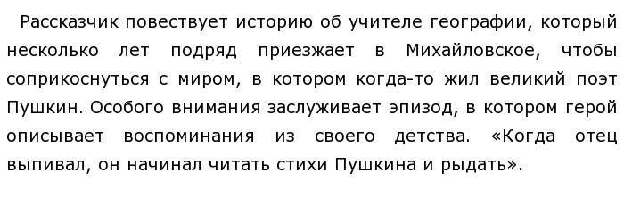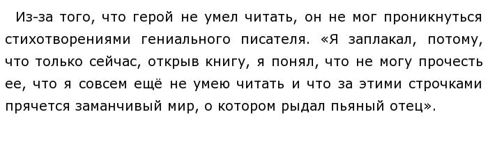 Что служит поводом для размышлений над этим вопросом? ![]() По моему мнению, проанализировав данный отрывок, мы понимаем, как творчество великого поэта влияло на отца главного героя. Чтобы полностью раскрыть проблему данного текста, обратимся к другому эпизоду, в котором учитель географии описывает свою первое знакомство с творчеством Пушкина. ![]() Действительно, анализ данного отрывка позволяет полностью раскрыть проблему данного текста и осознать какую роль играет поэзия в жизни человека. Эти два отрывка дополняют друг друга, и именно это даёт полное понимание проблемы. Прочитав и проанализировав их мы понимаем ответ на поставленный вопрос.