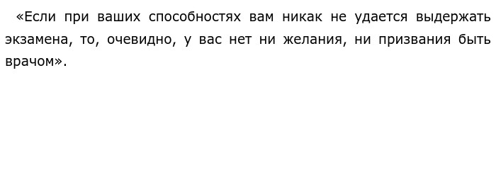 Халатное отношение к учебе по тексту Чехова (ЕГЭ по русскому)А.П.Чехов – мастер юмористических и сатирических рассказов. В данном тексте он высмеивает молодых людей, которые не хотят учиться. Отсюда вытекает проблема халатного отношения к учебе. Чтобы проиллюстрировать ее, обратимся к тексту. К профессору приходит домой «молодой человек приятной наружности», получающий единицы на экзаменах, чтобы попросить его поставить оценку «удовлетворительно». Таких студентов ежегодно «набирается человек семь». Преподаватель называет их «сангвиниками, широкими натурами», наверное, потому что они совершенно не переживают по поводу глубины своих знаний, их волнует только оценка за экзамен, чтобы не отчислили из университета. ![]() Таким образом, Чехов подводит к своей позиции, которую излагает устами преподавателя: ![]() Писатель утверждает, что недобросовестное отношение к учебе (где бы молодой человек ни учился) приводит к тому, что из него вырастет и неважный человек, и плохой специалист. Какой же это будет врач, если он выпрашивает оценки у преподавателя?! Как же он будет лечить людей?! У нас в классе, к счастью, все ребята занимаются с интересом. Причем, не только любимыми предметами, но и другими, которые есть в школьной программе. Добросовестно относиться к учебе нас учили родители, учителя начальной школы, и постепенно в каждом из нас возникла потребность не поверхностного изучения того или иного предмета, а глубокого. Например, я в подростковом возрасте увлекалась английским языком и мечтала быть учителем по этому предмету. А когда нам стали преподавать химию, я влюбилась в эту науку. Встал вопрос: кем быть – химиком или врачом? И вот в 11 классе однозначно решила – врачом. Очень много занимаюсь подготовкой к экзаменам по химии и биологии. Я надеюсь, что мой труд приведет к отличным результатам. И мои преподаватели не будут огорчены, а наоборот порадуются вместе со мной. Не как бедный профессор из рассказа Чехова. Итак, к учебе нужно относиться с любовью, потому что мы приобретаем новые знания, мы совершенствуемся. Обновлено: Опубликовал(а): ula_ershova Внимание! Спасибо за внимание. Полезный материал по теме