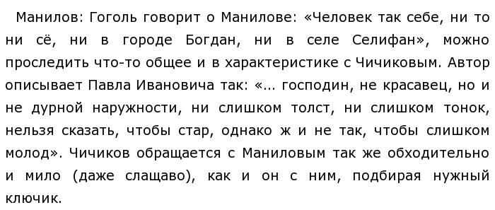 Сравнение Чичикова и помещиков в форме таблицы. По произведению «Мёртвые души» (Гоголь Н. В.)Некоторые отличительные черты помещиков присутствуют в Чичикове: ![]() Чичиков был не против бессмысленных разговоров и «благородных жестов». Манилов был любезнейшим человеком, Чичикова же считали таким человеком, думали: «что он любезнейший и обходительный человек». Коробочка: У Коробочки и Чичикова, казалось бы, так много различий. Главный герой – настоящий искатель приключений, человек достаточно умный, а Коробочка «дубиноголовая» (Так называл её сам Чичиков). Любовь к деньгам объединяет этих двух. Нельзя не обратить внимания на сходство комода Коробочки и шкатулки Чичикова. Они не просто хранят там вещи. Коробочка набивала свои «пестрядевые мешочки, размещенные по ящикам комодов» деньгами, как и Чичиков, у которого «весь верхний ящик со всеми перегородками вынимался, и под ним находилось пространство, занятое кипами бумаг в лист, потом следовал маленький потаенный ящик для денег, выдвигавшийся незаметно сбоку шкатулки» Ноздрев: Ноздрев – противоположность Чичикова. Главный герой не собирает сплетни, а его приход не предзнаменовал что-то плохое, но у них есть нечто схожее. Чичиков – путешественник, он постоянно в движении. Ноздрев «дома больше дня никак не мог усидеть». Ноздрев – богатый человек, то же самое можно сказать и о Чичикове. Ноздрев был человеком самовлюбленным, хвастливым, а Чичиков, например, постоянно стремился всем понравиться. ![]() Но истинная схожесть заключается в том, что они оба настоящие торгаши. Каждый пытается в сделке торговаться до победного конца. Они оба совершенные мошенники. Степан Плюшкин: Плюшкин лишен нормальных человеческих чувств, как когда-то их лишился и Чичиков. Плюшкин очень мелочный (можно ужаснуться от положения крестьян), абсолютно каждую вещь он хранит у себя, даже старый кулич, который превратился в сухарь; каждую мелочь. Можно вспомнить момент с афишей, когда Чичиков «свернул опрятно и положил в свой ларчик, куда имел обыкновение складывать все, что ни попадалось». Опять же любовь к деньгам может объединить этих двух персонажей. Конечно, Чичиков имеет множество отличий от этих помещиков. Его любовь к приключениям и оседлый образ жизни помещиков – вот главная отличительная черта. Многие помещики совершенно глупы, а Чичиков – наоборот. Обновлено: Опубликовал(а): chuikova Внимание! Спасибо за внимание.