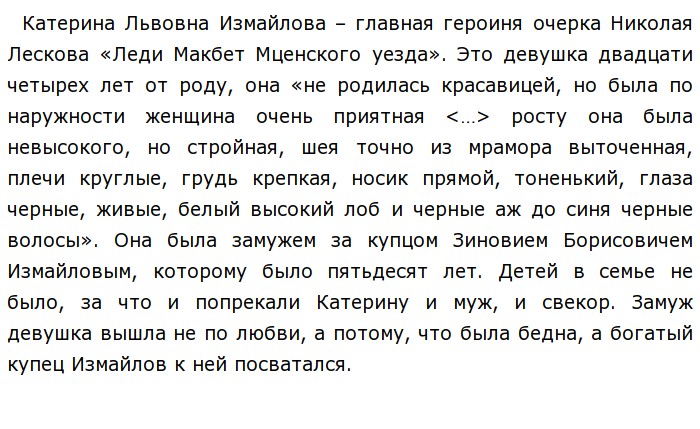 Характеристика Катерины Измайловой по повести Леди Макбет Мценского уезда (Лесков Н С)![]()